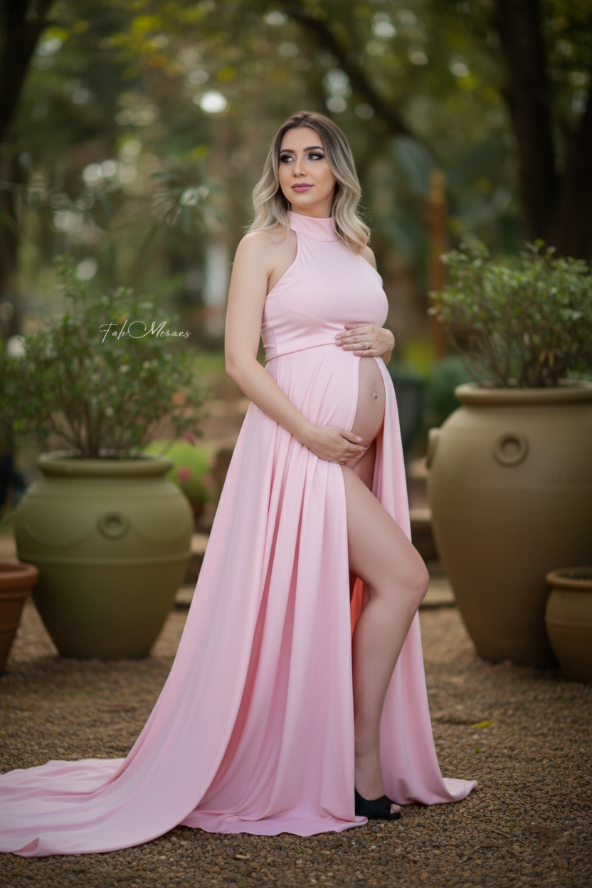Encante em cada clique com este vestido para ensaio gestante feito em malha helanca leve e fluida, ideal para ensaios ao ar livre ou estúdios mais frescos.
